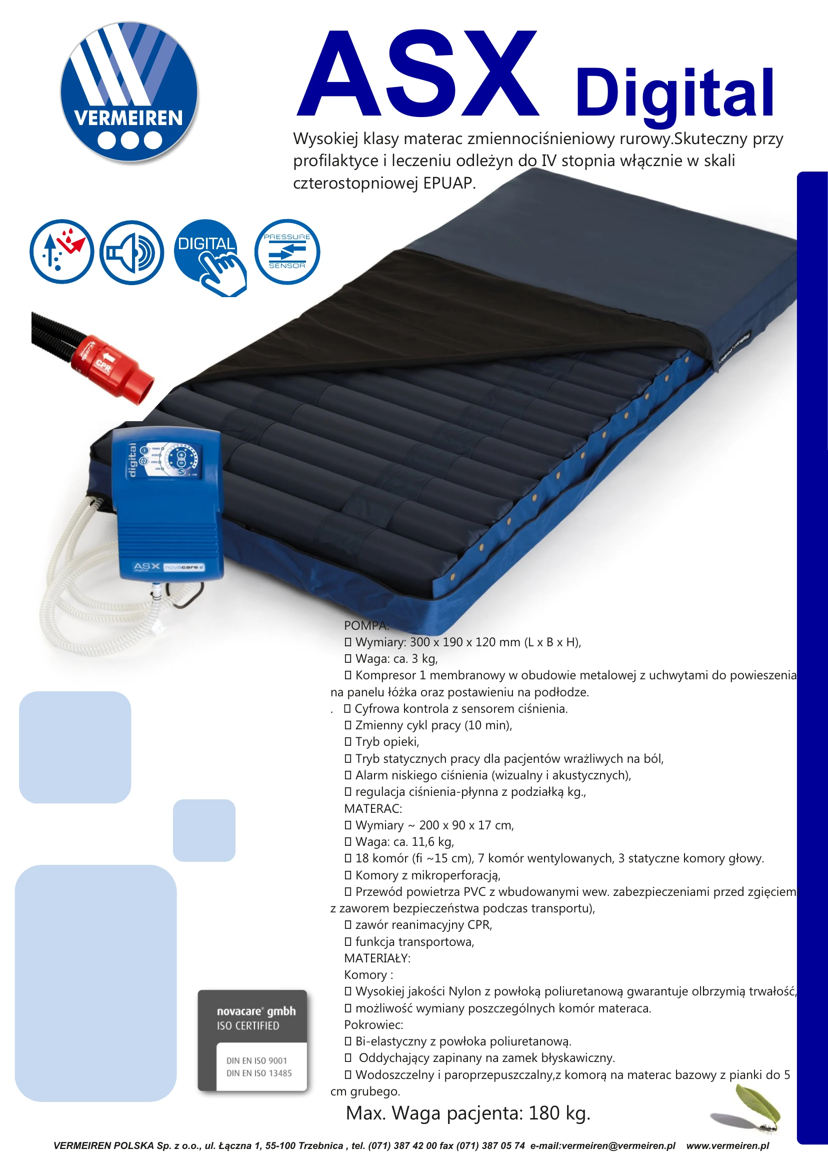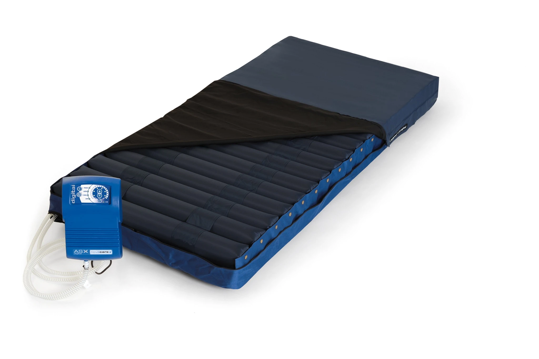 ASX DIGITAL Novacare to profesjonalny materac zmiennociśnieniowy przeznaczony do leczenia i profilaktyki odleżyn aż do IV stopnia. Dzięki 18 komorom powietrznym, cyfrowej regulacji ciśnienia i trybowi pracy dla pacjentów wrażliwych na ból, zapewnia maksymalne bezpieczeństwo i komfort. Idealny do użytku w placówkach medycznych i opiece długoterminowej.